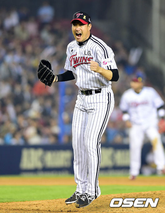 8회초 2사 만루에서 LG 봉중근이 롯데 황재균을 삼진으로 처리하고 환호하고 있다.