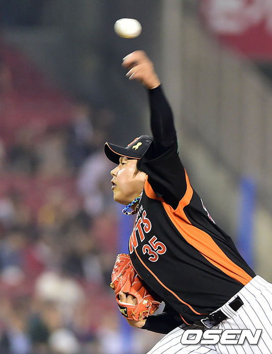 8회말 1사 1루 롯데 이명우가 힘차게 공을 던지고 있다.