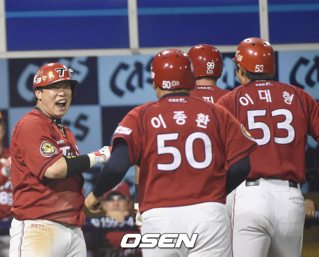 13일 오후 창원시 마산구장에서 열린 '2014 한국야쿠르트 세븐 프로야구' NC 다이노스와 KIA 타이거즈 경기,8회초 1사 2,3루 필의 동점 스리런 홈런포에 나지완이 득점 주자를 환영하고 있다.