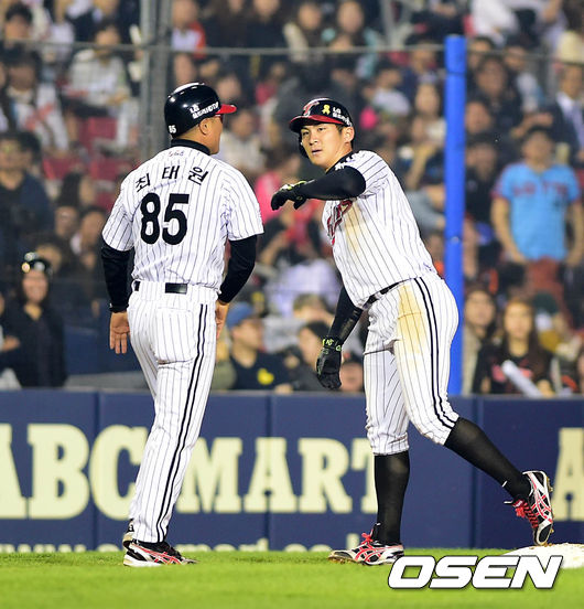 8회말 1사 1,2루에서 LG 오지환이 적시타를 치고 최태원 코치와 환호하고 있다.