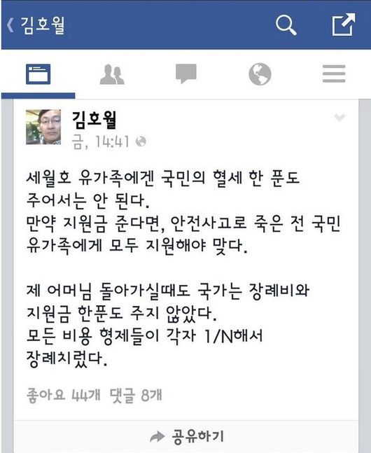 글이 삭제되기 전의 김호월 교수 페이스북.