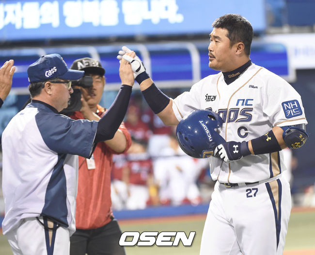 경기 종료후 이호준이 김경문 감독의 축하를 받고 있다.
