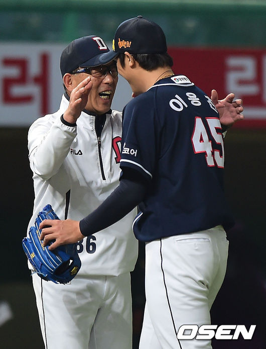 승리를 거둔 두산 송일수 감독이 이용찬과 포옹을 하고 있다./youngrae@osen.co.kr