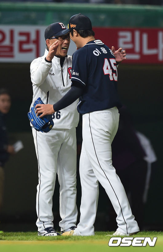 승리를 거둔 두산 송일수 감독이 이용찬과 포옹을 하고 있다./youngrae@osen.co.kr