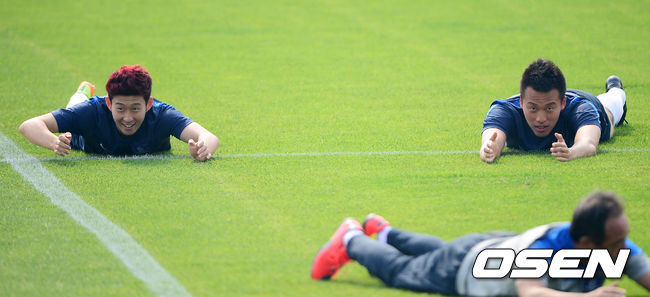 막상 김신욱과 만나자 손흥민은 옆에 찰싹 붙었다. 두 선수는 몸을 풀 때도, 단체러닝을 할 때도 항상 함께였다. 홍명보 감독은 게임형식의 가벼운 훈련으로 선수들의 긴장감과 피로도르 풀어줬다. 두 조로 나눈 대표팀은 상대팀이 차준 롱킥을 발리슛으로 미니골대에 넣는 게임을 했다. 박주영 등 내로라하는 공격수들도 헛방을 했다. 골키퍼 김승규가 첫 골을 넣자 선수들이 뒤집어졌다.