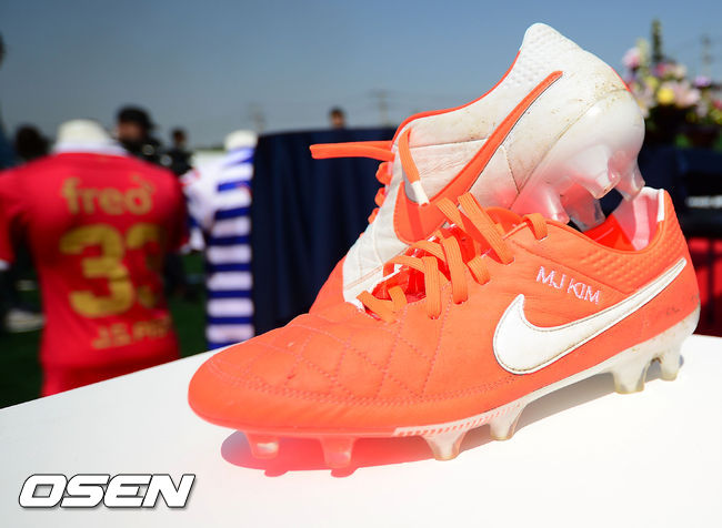 14일 오전 경기도 수원 박지성축구센터에서 열린 박지성 기자회견에서 박지성의 유니폼과 축구화가 전시되어 있다. 축구화에는 김민지 전 아나운서의 이니셜이 써있다.