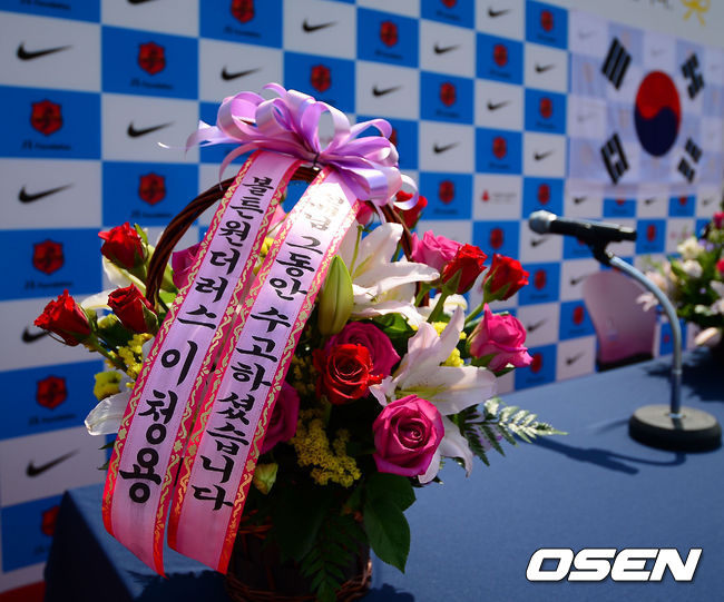 14일 오전 경기도 수원 박지성축구센터에서 열린 박지성 기자회견에서 이청용이 보낸 꽃바구니가 놓여져 있다.