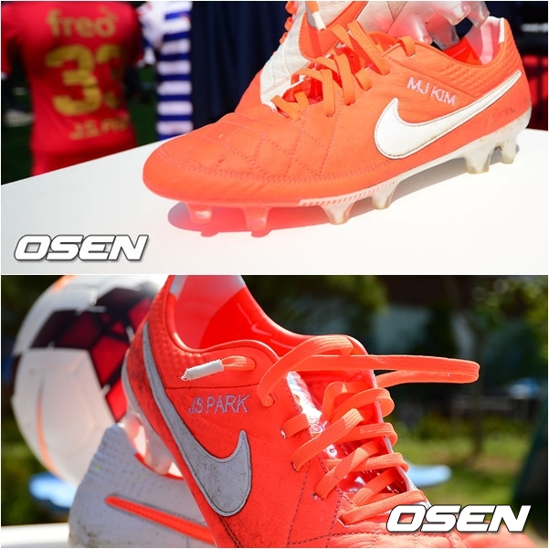 14일 오전 경기도 수원 박지성축구센터에서 열린 박지성 기자회견에서 박지성의 유니폼과 축구화가 전시되어 있다.