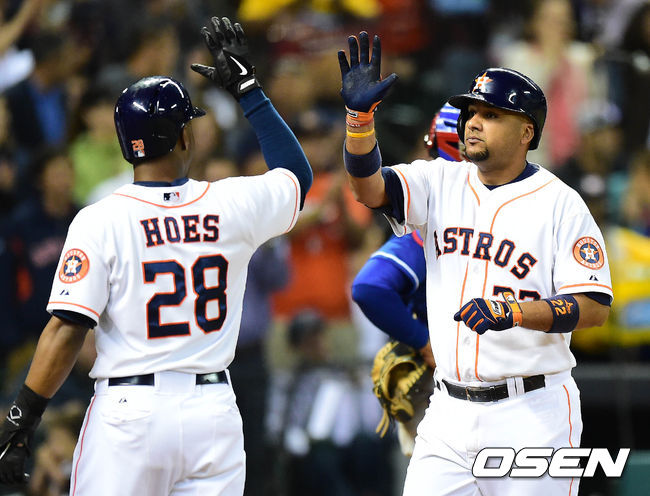 14일(이하 한국시각) 미국 텍사스주 휴스턴 미닛 메이드 파크에서 열린 '2014 메이저리그' 휴스턴 애스트로스와 텍사스 레인저스의 경기 5회말 무사 1,3루 코퍼랜이 스리런홈런을 치고 호스와 하이파이브를 하고 있다.
