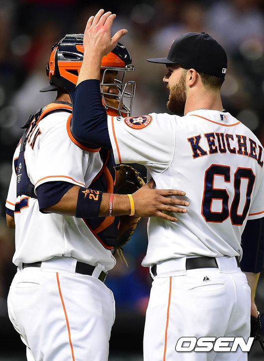 14일(이하 한국시각) 미국 텍사스주 휴스턴 미닛 메이드 파크에서 열린 '2014 메이저리그' 휴스턴 애스트로스와 텍사스 레인저스의 경기 종료 후 완봉투를 한 쿠첼과 코퍼랜이 하이파이브를 하고 있다.