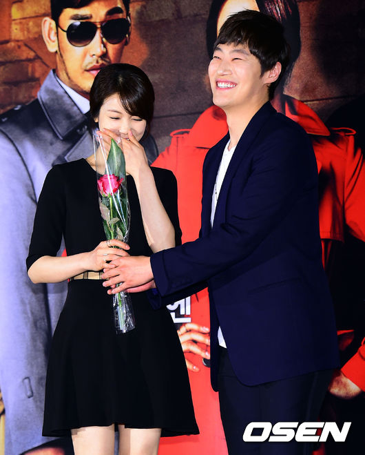 14일 오후 서울 동대문 메가박스에서 진행된 JTBC 드라마 '유나의 거리' 제작발표회 참석한 이희준이 로즈데이를 맞이하여 김옥빈에게 장미꽃을 전달하고 있다.