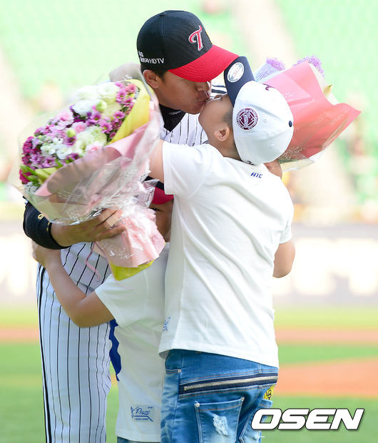 경기 시작에 앞서 열린 LG 이병규의 개인통산 2000안타를 달성을 기념하는 시상식에서 이병규가 두 아들과 함께 기념촬영을 하고 있다.