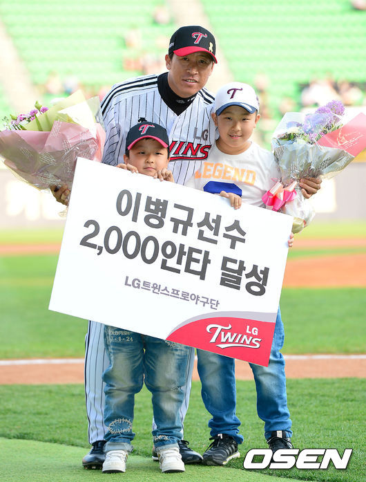 경기 시작에 앞서 열린 LG 이병규의 개인통산 2000안타를 달성을 기념하는 시상식에서 이병규가 두 아들과 함께 기념촬영을 하고 있다.