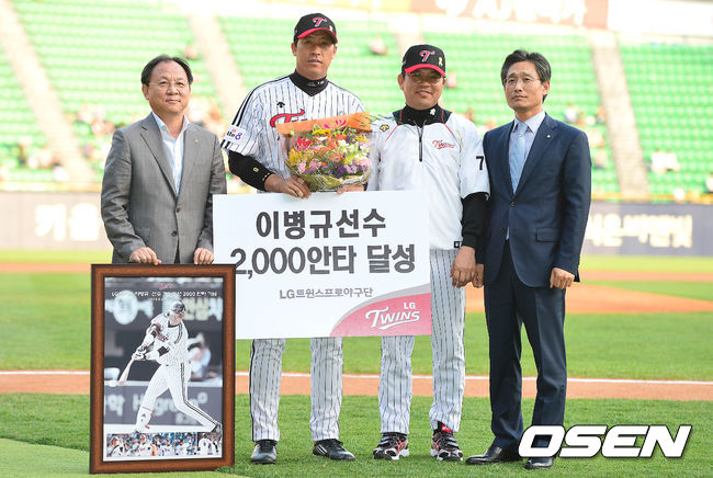 경기 시작에 앞서 열린 LG 이병규의 개인통산 2000안타를 달성을 기념하는 시상식에서 이병규, 양상문 감독, LG 백순길 단장, KBO 양해영 사무총장이 기념촬영을 하고 있다.