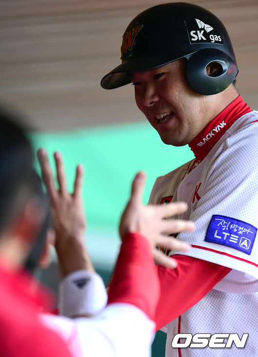 1회말 1사 2루 SK 이재원이 스캇의 적시타로 득점을 올린 뒤 동료들과 기뻐하고 있다.