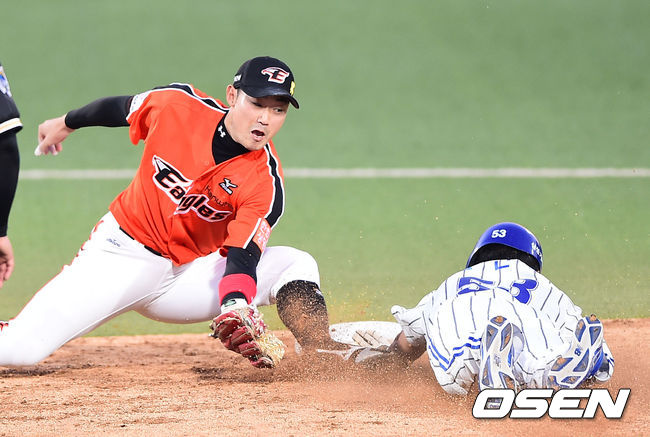14일 오후 대구구장에서 열린 2014 한국야쿠르트 세즌 프로야구 '2014 한국야쿠르트 세븐 프로야구' 삼성 라이온즈와 한화 이글스의 경기, 3회말 무사 1루 삼성 이흥련의 타석때 도루 시도한 1루 주자 김현곤이 한화 송광민 유격수에게 태그아웃되고 있다.