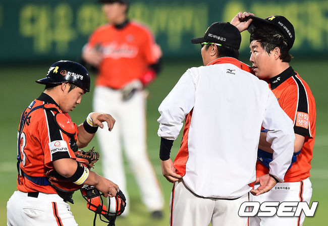 14일 오후 대구구장에서 열린 2014 한국야쿠르트 세즌 프로야구 '2014 한국야쿠르트 세븐 프로야구' 삼성 라이온즈와 한화 이글스의 경기, 3회말 밀어내기 볼넷으로 동점을 허용한 한화 송창현 선발투수가 정민철 투수코치와 마운드에서 이야기를 나누고 있다.