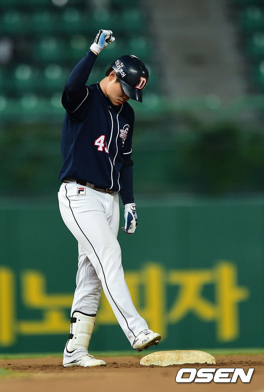 4회초 2사 1루 두산 민병헌이 1타점 적시 2루타를 때린 뒤 기뻐하고 있다.