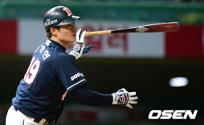 4회초 2사 1루 두산 민병헌이 1타점 적시 2루타를 때리고 있다.