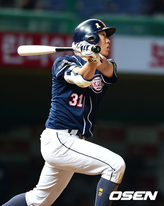 4회초 1사 1,3루 두산 정수빈이 중견수 희생플라이로 타점을 올리고 있다.
