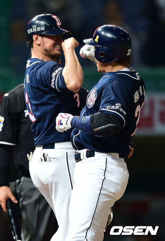 5회초 1사 1루 두산 홍성흔이 투런 홈런을 때린 뒤 칸투와 세레머니를 하고 있다.