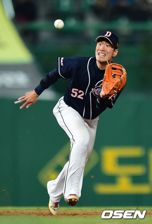 5회말 무사 두산 김재호가 SK 나주환의 뜬공을 잡아내고 있다.