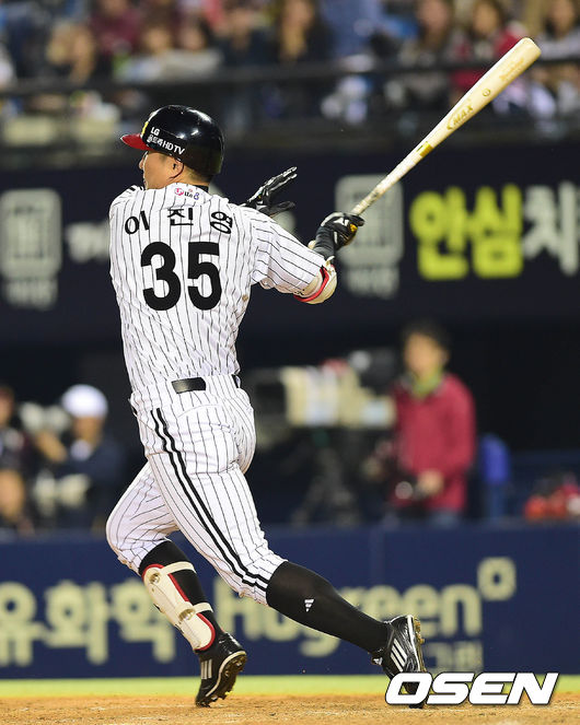5회말 LG 공격 2사 1, 2루 상황 이진영이 1타점 적시 우전안타를 날리고 있다.