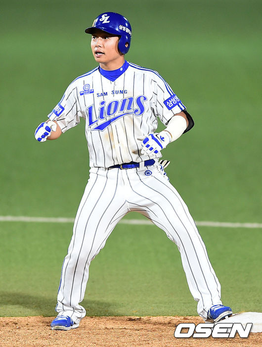 14일 오후 대구구장에서 열린 '2014 한국야쿠르트 세븐 프로야구' 삼성 라이온즈와 한화 이글스의 경기, 6회말 1사 1,2루 삼성 김헌곤이 1타점 적시타를 날리고 타임을 요청하고 있다.