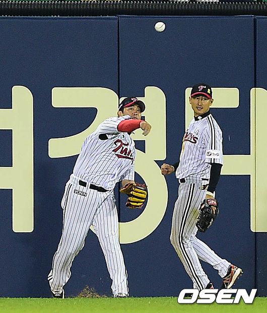 6회초 1사 1루 상황 황재균의 플라이 타구를 잡아낸 LG 좌익수 정의윤이 내야로 공을 던지고 있다.