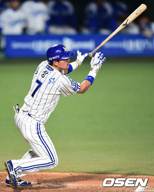 14일 오후 대구구장에서 열린 '2014 한국야쿠르트 세븐 프로야구' 삼성 라이온즈와 한화 이글스의 경기, 6회말 1사 만루 삼성 김상수가 2타점 적시타를 날리고 있다.