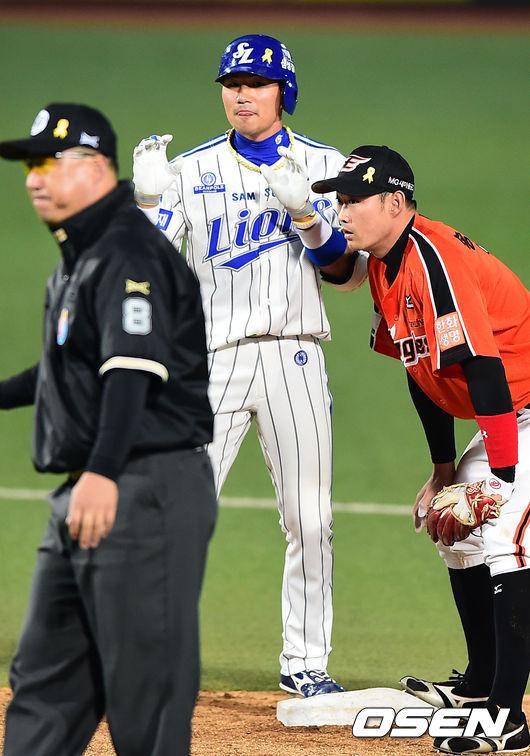 14일 오후 대구구장에서 열린 '2014 한국야쿠르트 세븐 프로야구' 삼성 라이온즈와 한화 이글스의 경기, 6회말 1사 만루 삼성 김상수가 2타점 적시타를 날리고 타임을 요청하고 있다.