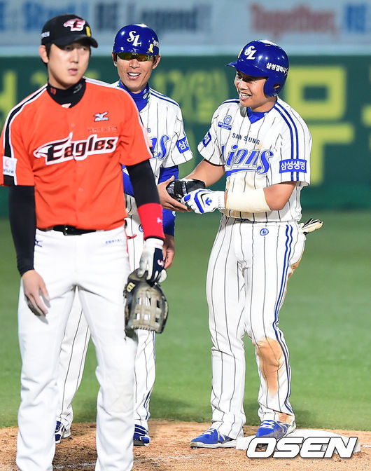 14일 오후 대구구장에서 열린 '2014 한국야쿠르트 세븐 프로야구' 삼성 라이온즈와 한화 이글스의 경기, 7회말 1사 2루 삼성 김헌곤이 1타점 3루타를 날린후 김재걸 코치와 하이파이브를 하고 있다.