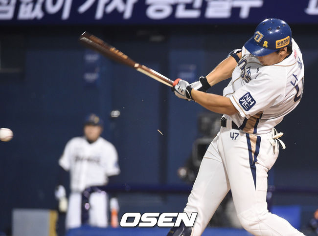 14일 오후 창원시 마산구장에서 열린 '2014 한국야쿠르트 세븐 프로야구' NC 다이노스와 KIA 타이거즈 경기,6회말 2사 나성범 배트가 부러지면서 내야안타를 날리고 있다.