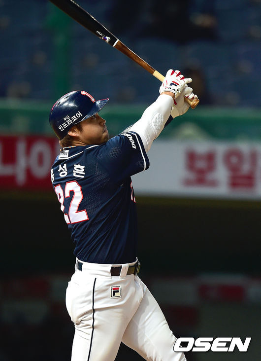 8회초 2사 두산 홍성흔이 SK 임경완을 상대로 솔로 홈런을 때리고 있다.