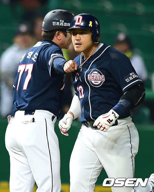 8회초 2사 두산 홍성흔이 SK 임경완을 상대로 솔로 홈런을 때린 뒤 전형도 코치와 세레머니를 하고 있다.