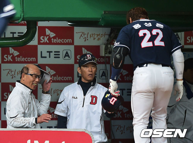 8회초 2사 두산 홍성흔이 SK 임경완을 상대로 솔로 홈런을 때린 뒤 송일수 감독과 세레머니를 하고 있다.