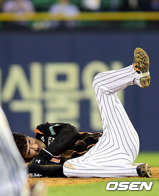 8회초 롯데 공격 1사 1루 상황 대타 박종윤 타석 때 도루를 시도한 오승택이 LG 유격수 오지환과 충돌한 뒤 괴로워하고 있다.