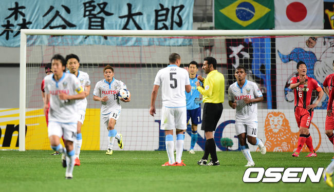 후반 가와사키 모리시마 야스히토가 역전골을 성공시키자 동료선수들이 빠른 경기 준비를 하고 있다. /jpnews@osen.co.kr