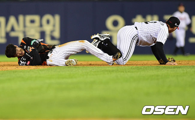 8회초 롯데 공격 1사 1루 상황 대타 박종윤 타석 때 도루를 시도한 오승택이 LG 유격수 오지환과 충돌한 뒤 괴로워하고 있다. 이후 오승택은 응급차에 실려 나갔다.