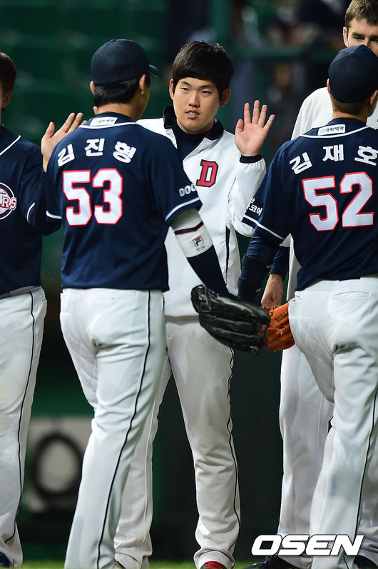 승리를 거둔 두산 정대현이 동료들과 기뻐하고 있다./youngrae@osen.co.kr