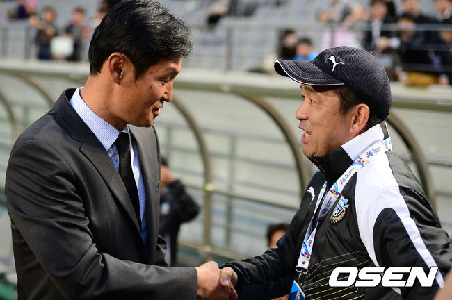 경기에 앞서 FC서울 최용수 감독과 가와사키 카자마 야히로 감독이 인사를 나누고 있다. /jpnews@osen.co.kr