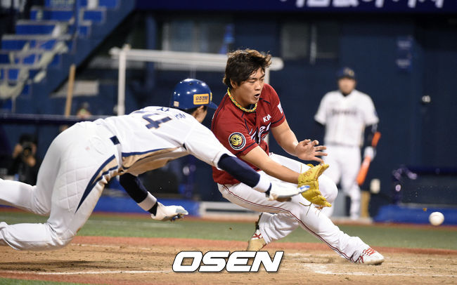 14일 오후 창원시 마산구장에서 열린 '2014 한국야쿠르트 세븐 프로야구' NC 다이노스와 KIA 타이거즈 경기,8회말 1사 만루 KIA 심동섭 투수의 와일드 피칭때 3루 주자 이상호 홈으로 쇄도 동점 득점을 올리고 있다.