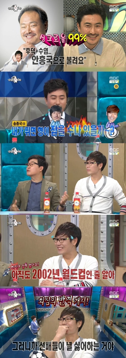 ‘라디오스타’ 송종국이 깐족입담으로 선배 안정환을 제압해 웃음을 자아냈다.