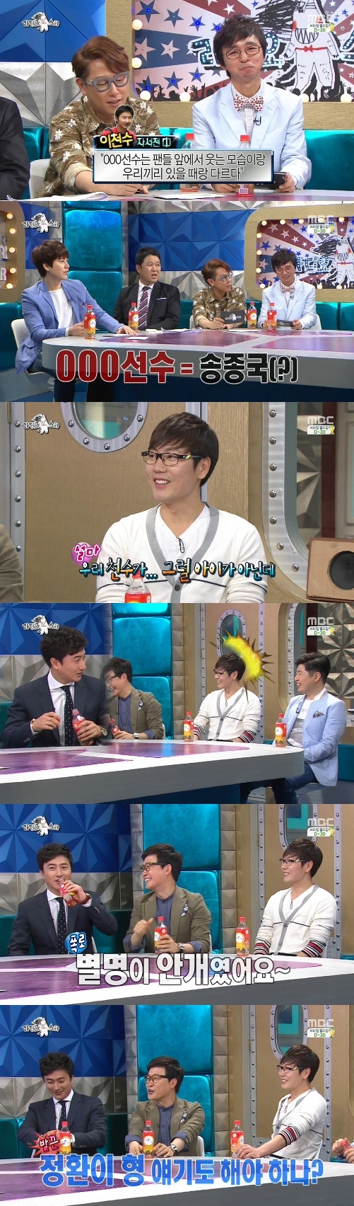 이에 라스 MC들은 “OOO선배는 팬들 앞에서 웃는 모습이랑 우리끼리 있을 때랑 다르다. 너무 가식적이다. 여자를 많이 밝힌다”는 이천수의 자서전 내용을 언급, 루머 속 선배로 소문이 난 송종국에게 사실이 아니냐고 돌직구 질문을 던졌다.