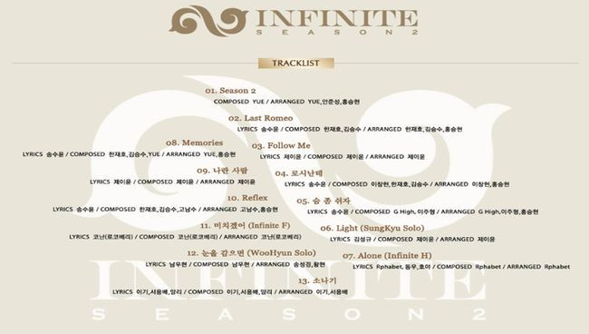 인기그룹 인피니트가 총 13곡이 담긴 정규2집 '시즌2'의 트랙리스트를 15일 공개했다.