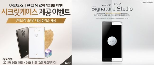 팬택은 ‘베가 아이언2’ 구매자 중 선착순 3만명을 대상으로 ‘시크릿 케이스’를 증정하는 이벤트와 엔드리스 메탈에 각인할 시그니쳐를 가상으로 디자인해 볼 수 있는 ‘시그니쳐 스튜디오’ 이벤트를 동시 진행한다고 15일 밝혔다.