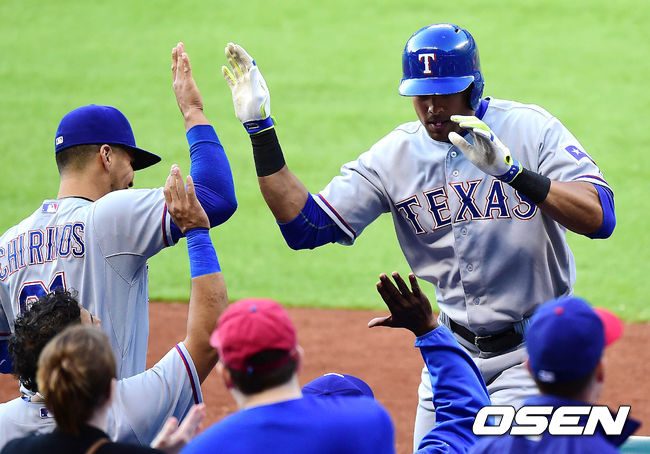 15일(이하 한국시각) 미국 텍사스주 휴스턴 미닛 메이드 파크에서 열린 '2014 메이저리그' 휴스턴 애스트로스와 텍사스 레인저스의 경기 2회초 1사 리오스가 솔로포를 치고 덕아웃으로 향하며 동료들과 하이파이브를 하고 있다.