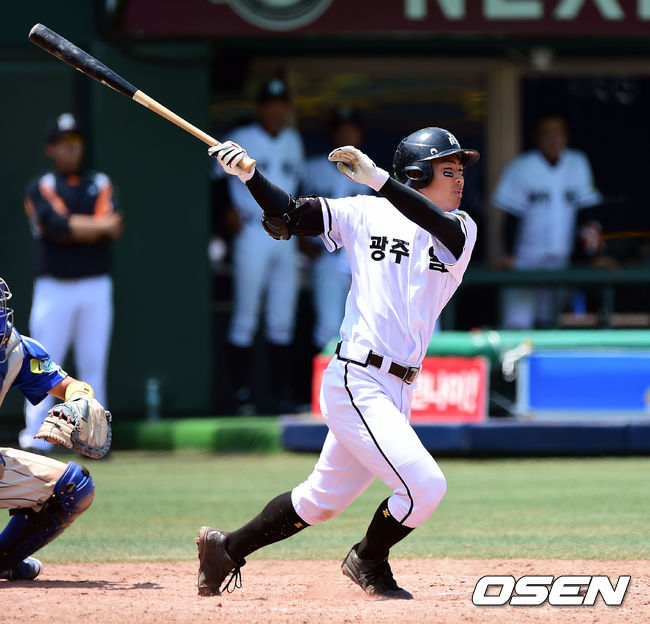 8회말 2사 2루 광주일고 한두솔이 1타점 적시타를 때리고 있다.