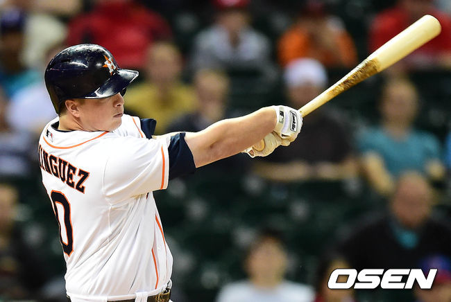 15일(이하 한국시각) 미국 텍사스주 휴스턴 미닛 메이드 파크에서 열린 '2014 메이저리그' 휴스턴 애스트로스와 텍사스 레인저스의 경기 9회말 1사 1,2루 도밍게스가 끝내기 안타를 치고 있다.