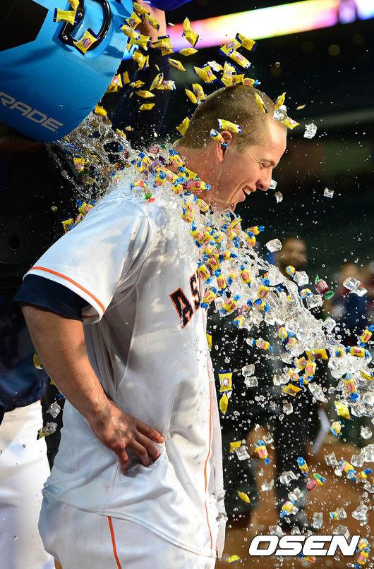 15일(이하 한국시각) 미국 텍사스주 휴스턴 미닛 메이드 파크에서 열린 '2014 메이저리그' 휴스턴 애스트로스와 텍사스 레인저스의 경기 종료 후 도밍게스가 동료들에게 물세례를 받고 있다.